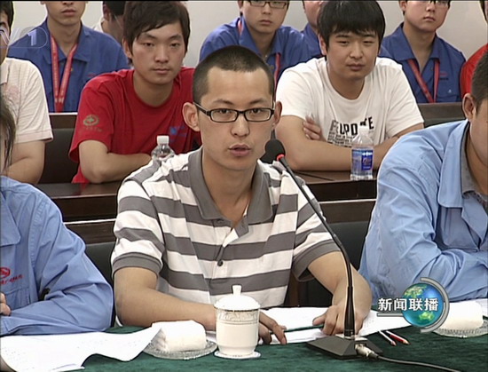 在全国人民喜庆端午节之际,温家宝总理在看望慰问节日期间坚守岗位的农民工时召开了新一代农民工代表座谈会。作为223名到北京就读的四川灾区转移学生代表,首钢技师学院学生刘世涛有幸参加了座谈会,并向温总理作了汇报。