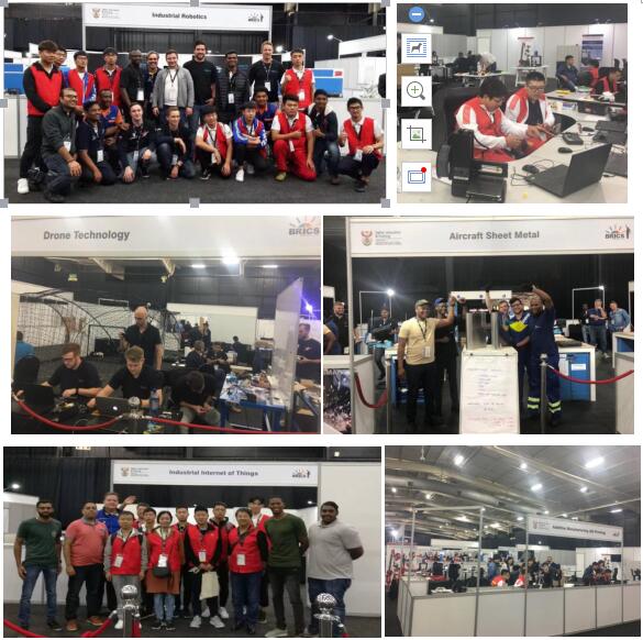 中方技能组率领来自北京电子科技职业技术学院、黄河水利职业技术学院、宁夏职业技术学院、九江职业技术学院、烟台职业学院、福建信息职业技术学院、河北工业职业技术学院、武汉城市职业学院、廊坊职业技术学院、广西机电职业技术学院、贵州电子信息职业技术学院、周口职业技术学院、大庆油田有限责任公司、湖北生态工程职业技术学院等单位的74名代表团成员参加了南非的物联网赛项、CNC数控多轴加工赛项、3D打印赛项、工业机器人赛项、智能制造赛项、无人机赛项以及焊接和机器人焊接14个赛项。