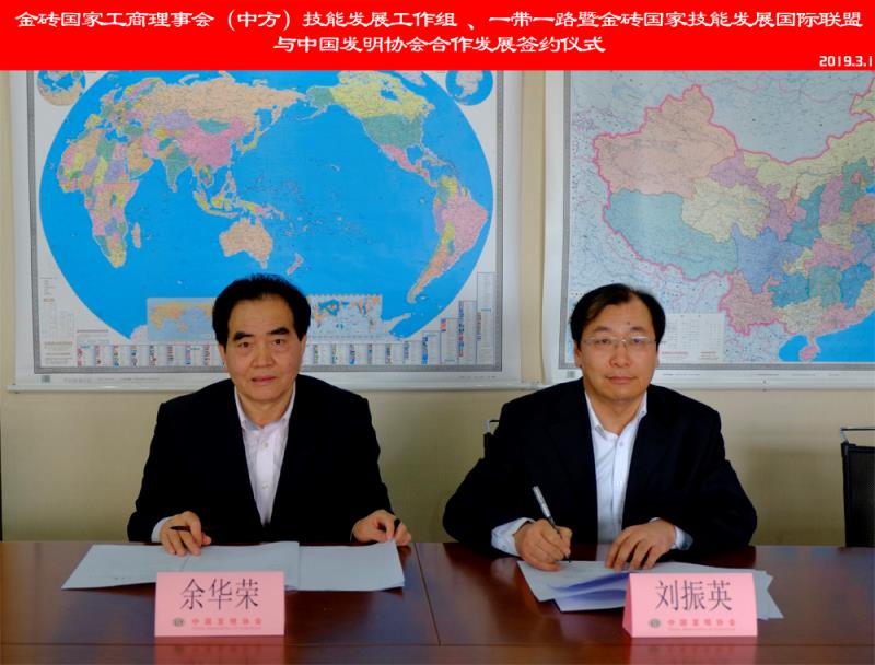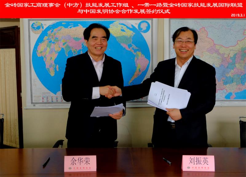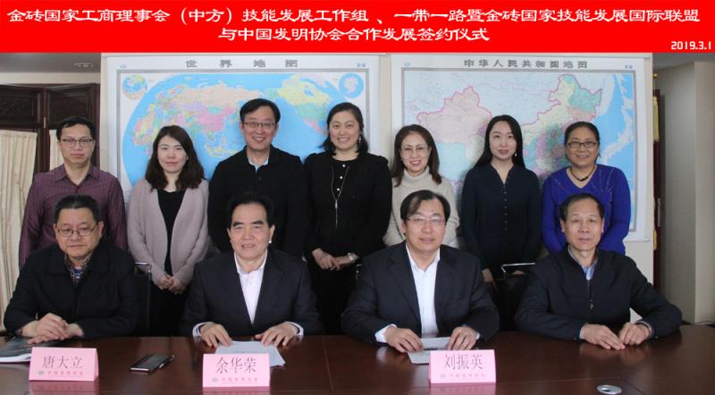 2019年3月1日,金砖国家工商理事会(中方)技能发展工作组及一带一路暨金砖国家技能发展国际联盟与中国发明协会正式签署合作发展协议,双方将联合主办2019第三届金砖国家技能发展与技术创新大赛(以下简称金砖大赛),并合作探索一带一路暨金砖“好发明”赛项科技创新之路。金砖国家工商理事会(中方)技能发展工作组组长、一带一路暨金砖国家技能发展国际联盟理事长刘振英博士与中国发明协会党委书记、常务副理事长兼秘书长余华荣代表双方签约,并举行了首轮金砖大赛筹备工作交流座谈会。