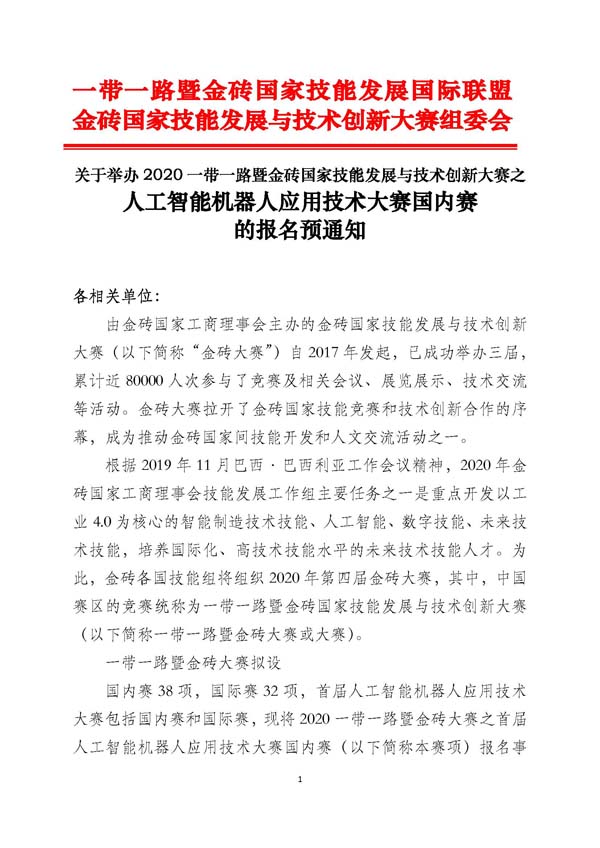 一带一路暨金砖大赛拟设国内赛38项,国际赛32项,首届人工智能机器人应用技术大赛包括国内赛和国际赛,现将2020一带一路暨金砖大赛之首届人工智能机器人应用技术大赛国内赛(以下简称本赛项)报名事宜通知如下: