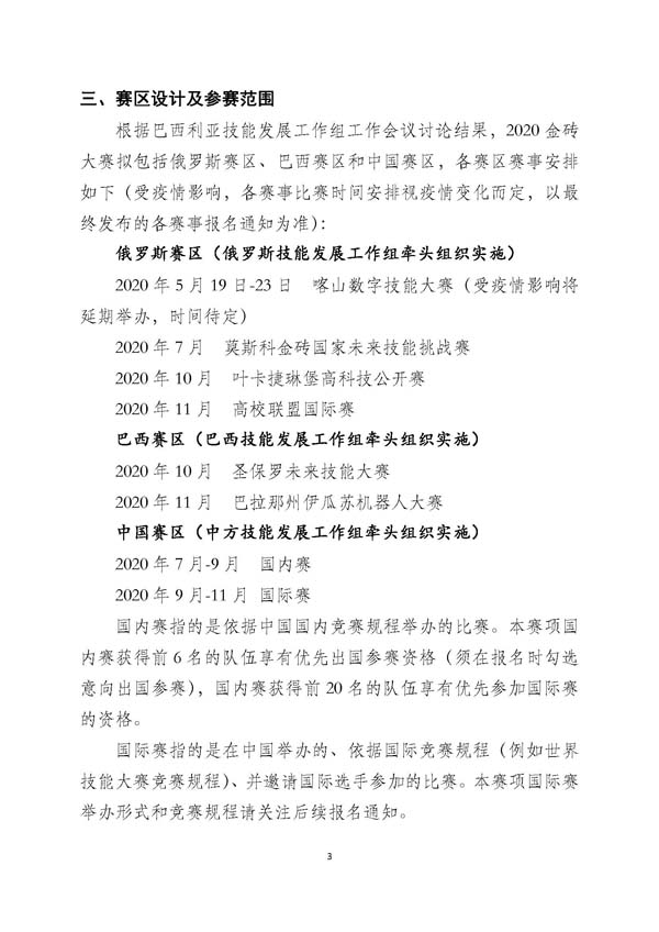 根据巴西利亚技能发展工作组工作会议讨论结果,2020金砖大赛拟包括俄罗斯赛区、巴西赛区和中国赛区,各赛区赛事安排如下(受疫情影响,各赛事比赛时间安排视疫情变化而定,以最终发布的各赛事报名通知为准):