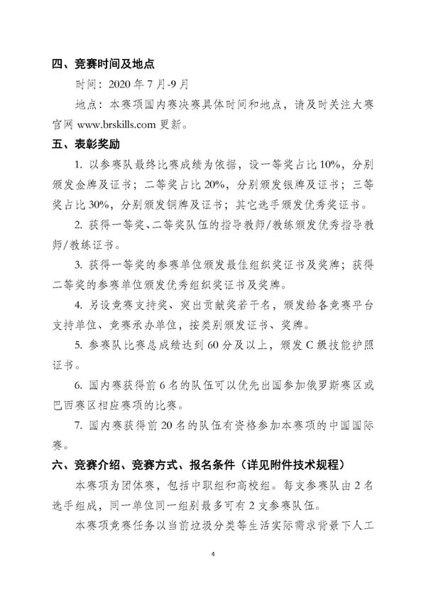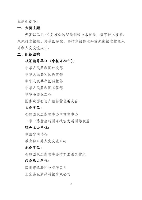 根据2019年11月巴西·巴西利亚工作会议精神,2020年金砖国家工商理事会技能发展工作组主要任务之一是重点开发以工业4.0为核心的智能制造技术技能、人工智能、数字技能、未来技术技能,培养国际化、高技术技能水平的未来技术技能人才。为此,金砖各国技能组将组织2020年第四届金砖大赛,其中,中国赛区的竞赛统称为一带一路暨金砖国家技能发展与技术创新大赛(以下简称一带一路暨金砖大赛或大赛)。