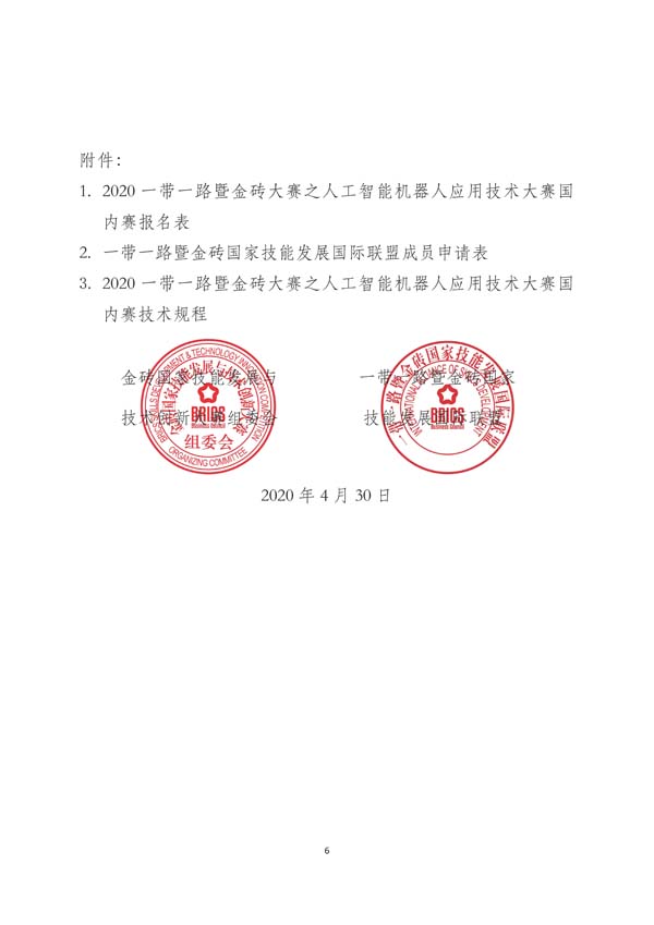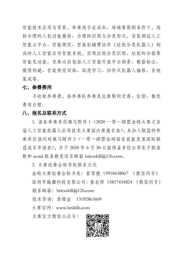 1. 请各参赛单位填写附件1《2020一带一路暨金砖大赛之首届人工智能机器人应用技术大赛国内赛报名表》,未加入联盟的参赛单位请同时填写附件2《一带一路暨金砖国家技能发展国际联盟成员申请表》,并于2020年6月30日前将盖单位公章电子版表格和word版表格发送至邮箱bricsskill@126.com。