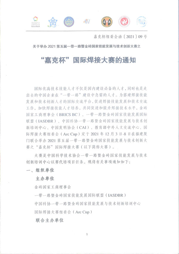国际化高技术技能人才不仅是国内建设必备的人才,同时也是走出去的中国企业在“一带一路”建设中急需的人才。为搭建焊接技能发展和技术创新人才的国际交流平台,促进焊接技能发展和技术交流工作,加快焊接技能人才培养,共同促进和提升焊接技术水平,金砖国家工商理事会(BRICS BC)、一带一路暨金砖国家技能发展国际联盟(IASDBR)、中国科协一带一路暨金砖国家技能发展与技术创新培训中心、中国发明协会(CAI)、教育部中外人文交流中心、国际焊接大赛组委会(Arc Cup)定于2021年12月3日-8日在福建厦门联合举办2021第五届一带一路暨金砖国家技能发展与技术创新大赛之“嘉克杯”国际焊接大赛(以下简称大赛)。