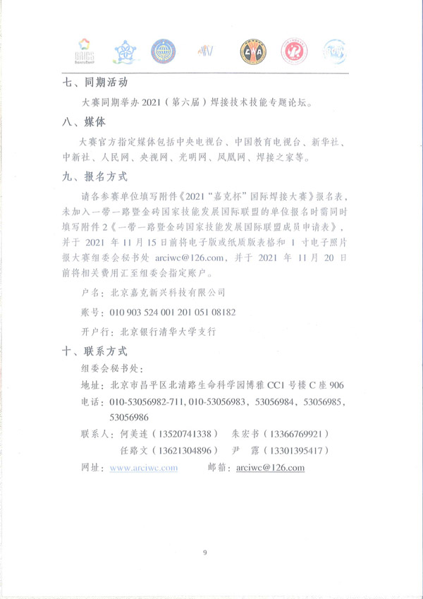 请各参赛单位填写附件《2021“嘉克杯”国际焊接大赛》报名表,未加入一带一路暨金砖国家技能发展国际联盟的单位报名时需同时填写附件2《一带一路暨金砖国家技能发展国际联盟成员申请表》,并于 2021 年11月15日前将电子版或纸质版表格和 1 寸电子照片报大赛组委会秘书处 arciwc@126.com,并于 2021 年 11月 20 日前将相关费用汇至组委会指定账户。